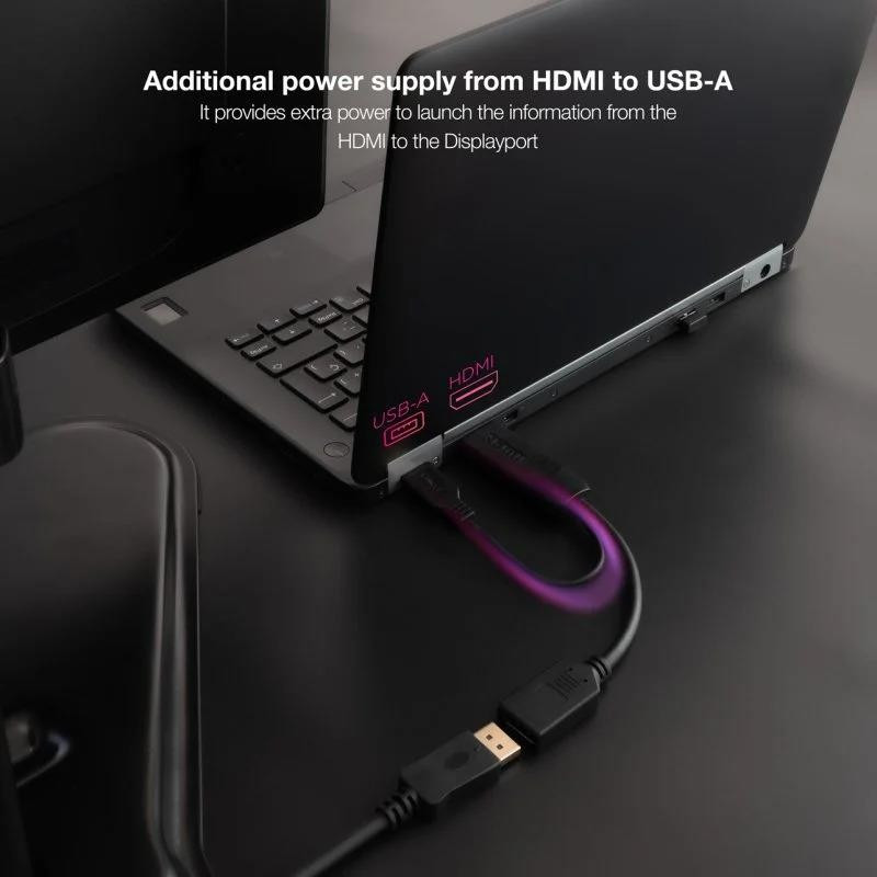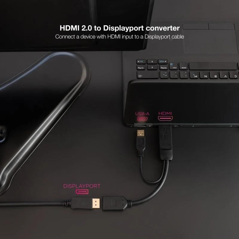 Transforma la señal de tu HDMI a DisplayPort. Es compatible con HDMI 2.0, DP V1.2 y todas sus versiones anteriores ¡Además dispone de alimentador a través de su cable USB-A por si lo necesitas!