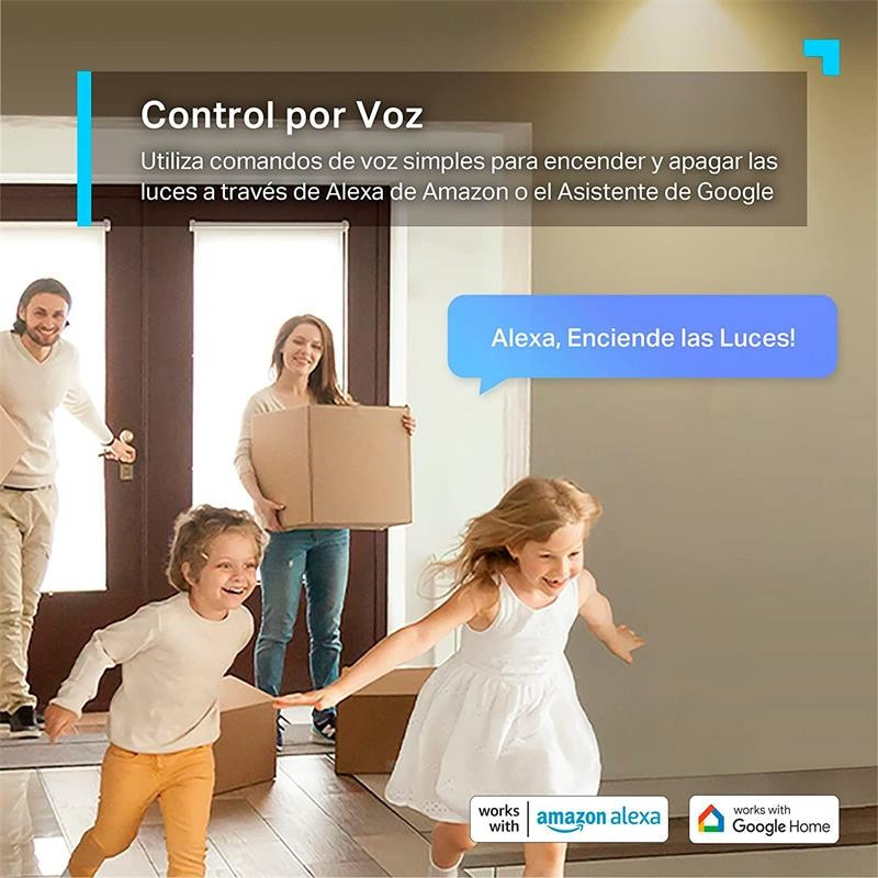 - Control por voz. Controla el interruptor directamente con comandos de voz a través de Amazon Alexa o el Asistente de Google.