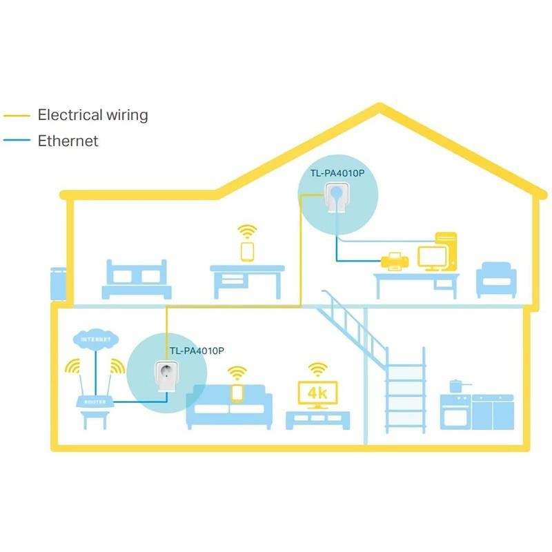 El TL-PA4010P KIT convierte su línea eléctrica existente en una red de alta velocidad sin necesidad de cables nuevos o de perforación. No se requiere configuración, simplemente conecte el adaptador a su toma de corriente y puede establecer la infraestructura de red en un instante. Además, su toma de corriente integrada asegura que ninguna toma de corriente va a perder. Con velocidades de hasta 600Mbps y 300 metros sobre los cables eléctricos domésticos, el TL-PA4010P KIT es una gran opción para una fácil de construir la red de entretenimiento multimedia.