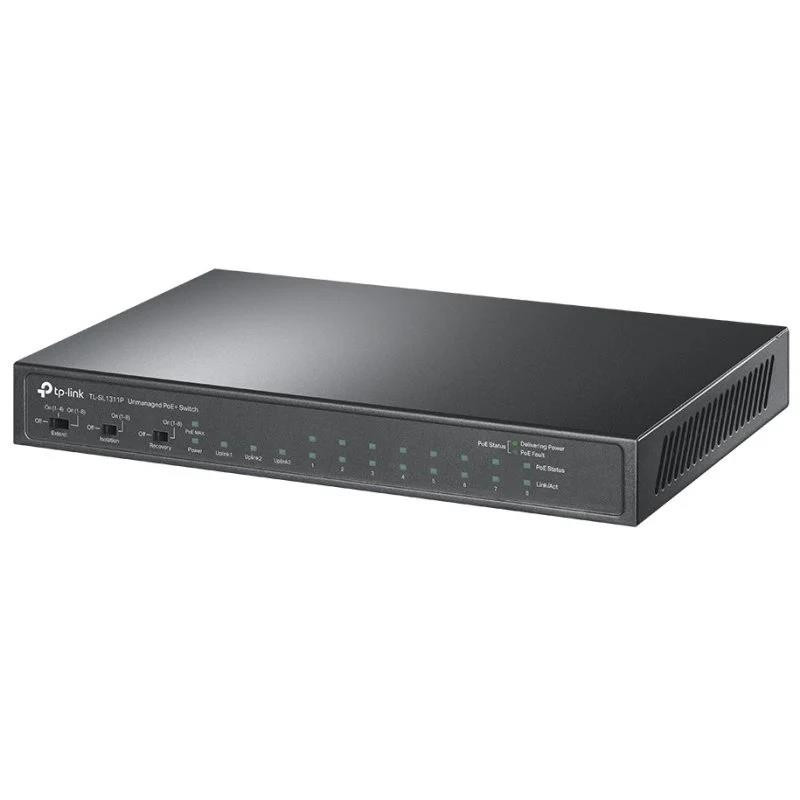 Un switch TP-Link TL-SL1311P que cuenta con 8 puertos RJ45 de 10/100 Mbps, 2 puertos Gigabit RJ45 y 1 puerto SFP Gigabit. Tiene 8 puertos PoE+ que transfieren datos y energía en cables individuales, y funciona con PD compatibles con IEEE 802.3af/at. Además, admite alimentación PoE de hasta 30 W para cada puerto PoE. Un modo de aislamiento permite la separación del tráfico de clientes con un solo clic para aumentar la seguridad y el rendimiento.