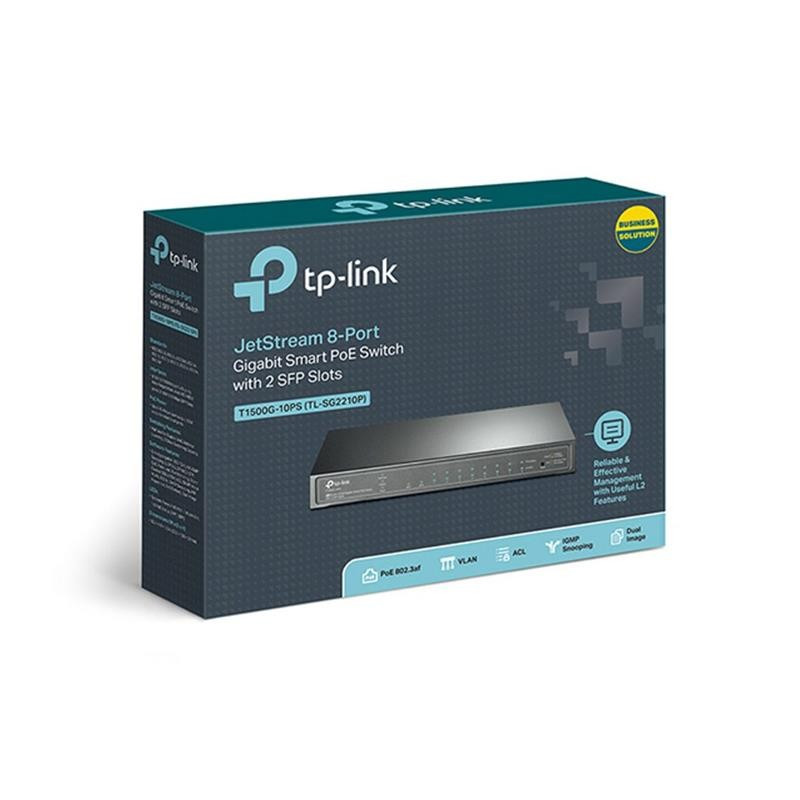 El Smart Switch T1500G-10PS de TP-Link JetStream cuenta con 8 puertos RJ45 gigabits y 2 ranuras SFP, todos los puertos RJ45 admiten el estándar 802.3af con una potencia total de 53W y funciones de administración de energía PoE útiles.