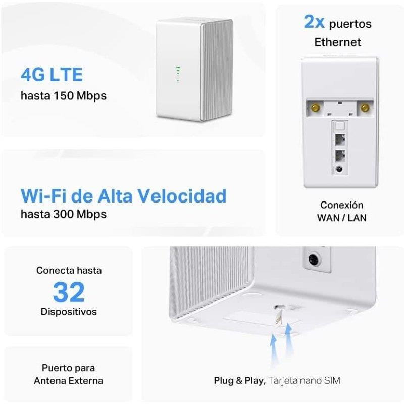 Crea tu propio Wi-Fi desde la red 4G LTE, para alcanzar una velocidad de hasta 150 Mbps de descarga y 50 Mbps de carga. También puedes crear una red Wi-Fi de alta velocidad hasta 300 Mbps en 2,4 GHz para ver series y películas online, gaming y videollamadas.