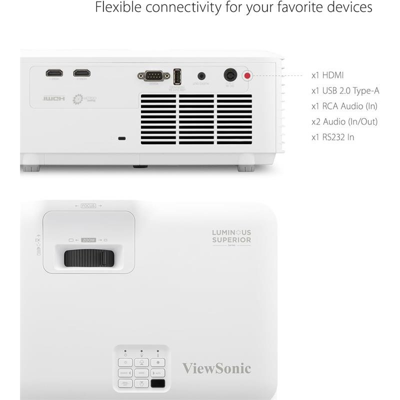 - Conectividad Completa: Dispone de múltiples entradas (2 x HDMI, 1 x VGA) y salidas (audio de 3.5 mm, USB-A para alimentación y RS-232 para control remoto), permitiendo la conexión de PCs, reproductores multimedia y otros dispositivos, además de la posibilidad de gestionar el proyector de forma remota mediante sistemas compatibles (Crestron, AMX, Extron, PJ Link, ATEN y el vController de ViewSonic).