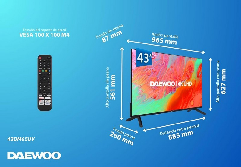 - Dimensiones: 965×561×87 mm (sin peana) – soporte VESA 100×100 mm