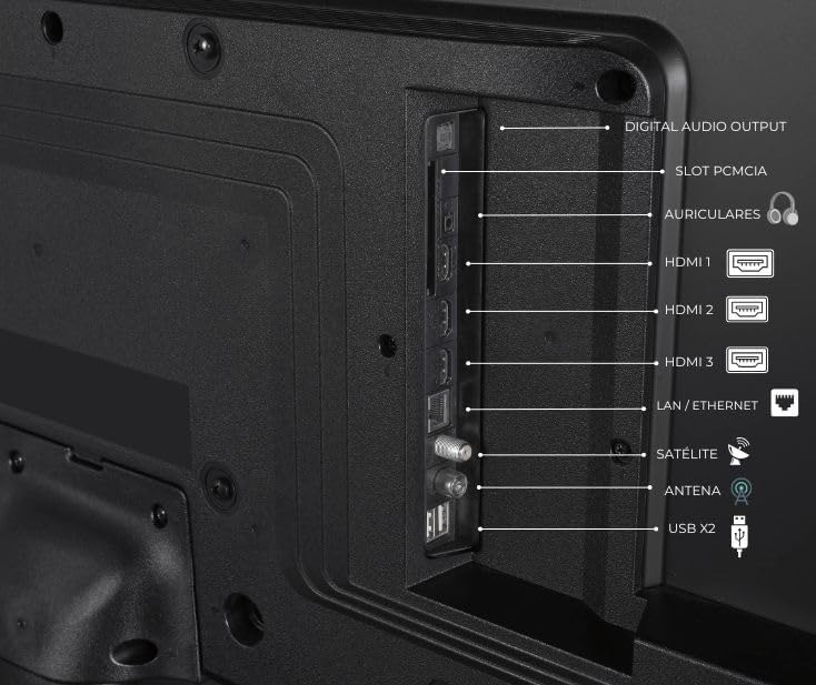 - Puertos: 3× HDMI, 2× USB (PVR ready), salida óptica, toma para auriculares