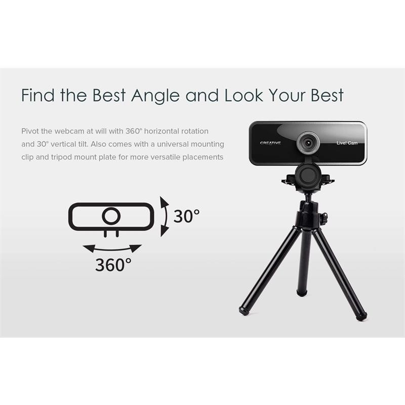 • Vídeo panorámico Full HD y un buen aspecto desde cualquier ángulo: Creative Live. Cam Sync 1080p V2 te presenta vídeos Full HD precisos que son fluidos, nítidos y vibrantes. El amplio campo de visión de 77° te permite capturar más de todo con una mínima distorsión óptica, lo que te permite realizar videollamadas cómodamente como grupo. Además, la cámara se puede girar 360° horizontalmente e inclinar 30° verticalmente y se suministra con una pinza de montaje universal