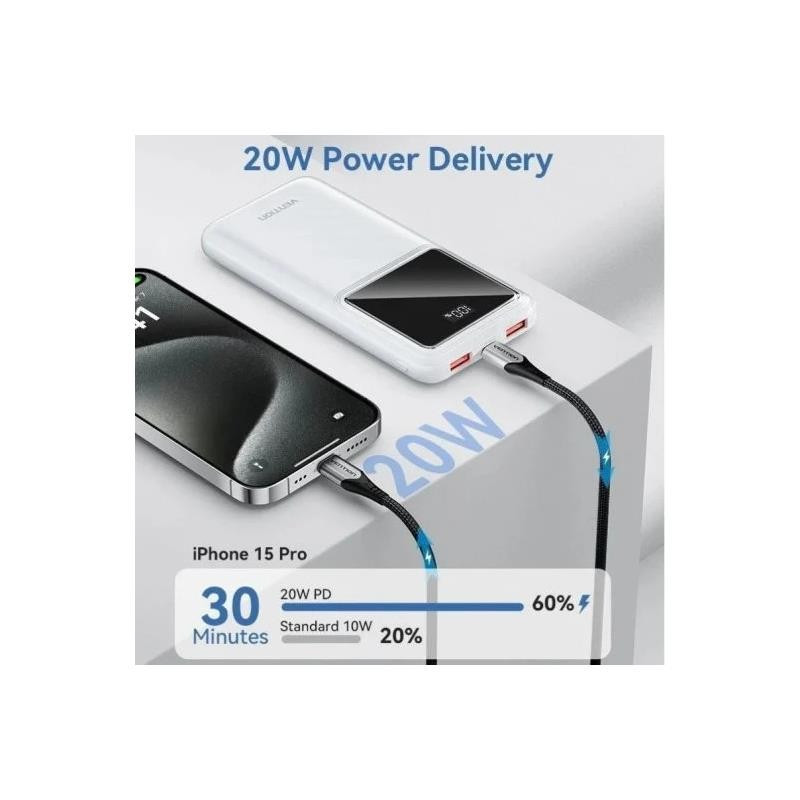 POWERBANK VENTION 10000MAH 2XUSB-A + USB-C LED DISPLAY 22.5W WHITE