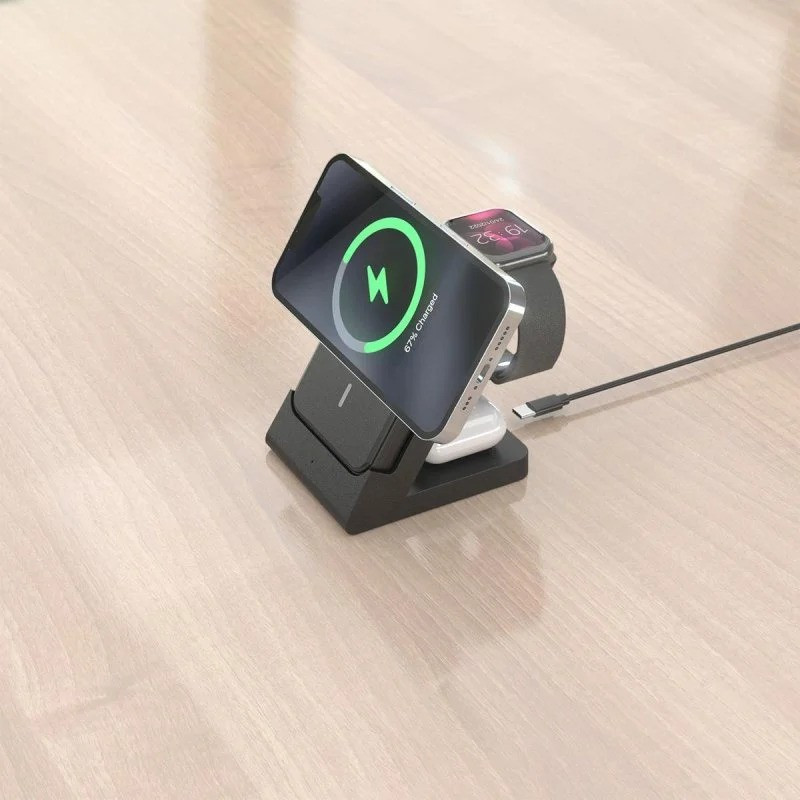 Carga múltiple inteligente. Este cargador fue creado para usuarios exigentes: recarga de manera inalámbrica hasta tres dispositivos a la vez —tu smartphone, tus auriculares con estuche de carga y Apple Watch— manteniendo la máxima eficiencia y velocidad gracias al estándar Qi y su potencia de hasta 15W. Es compatible con dispositivos magnéticos y móviles Qi2, optimizando el anclaje y la seguridad durante la carga.