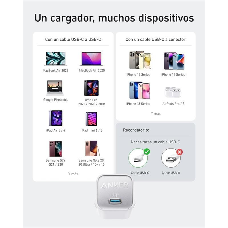 El cargador Anker utiliza tecnología de nitruro de galio (GaN) para proporcionar 30 W de potencia en un diseño extremadamente compacto, un 70 % más pequeño que los cargadores convencionales de 30 W. Es perfecto para cargar rápidamente iPhone 15 Pro, Pro Max y iPad Air (5ª generación), alcanzando el 50 % de carga en solo 45 minutos. Además, cuenta con protección avanzada Active Shield 2.0 para garantizar la seguridad de tus dispositivos en cada carga.