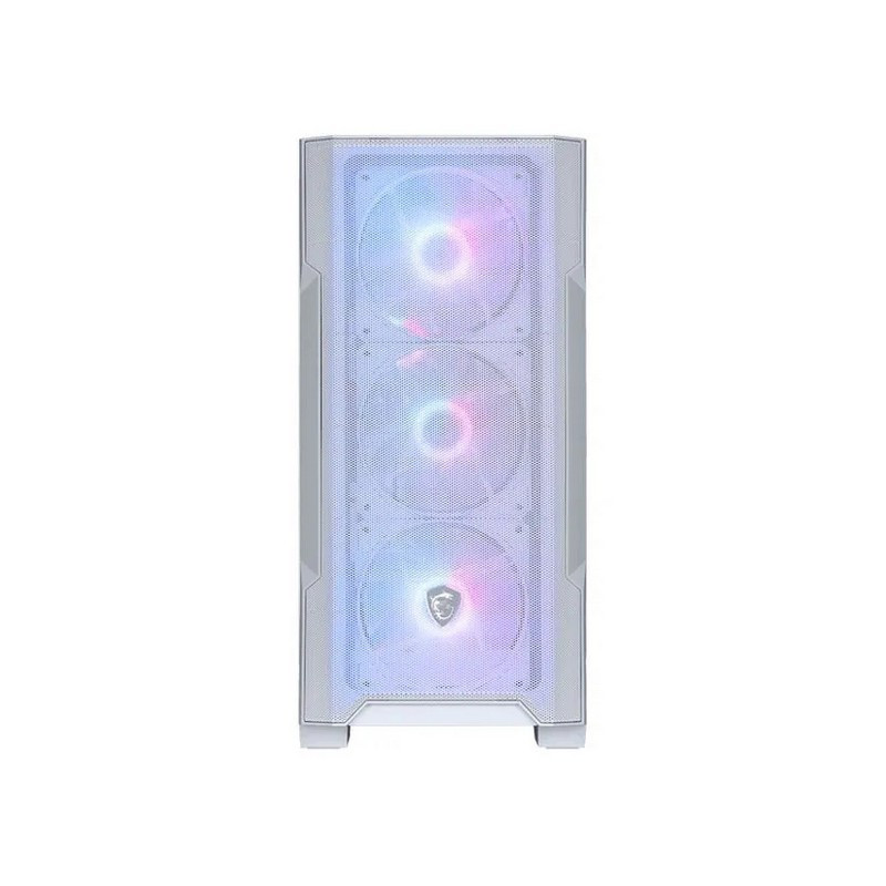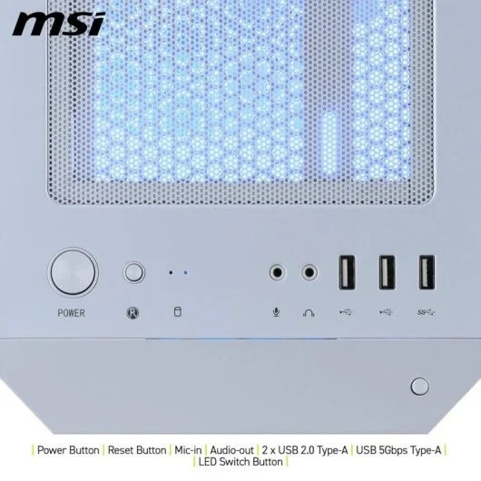 Conectores del Panel Frontal: 1× USB 3.2 Gen 1 (Tipo-A) + 2× USB 2.0 + 1× salida de audio + 1× entrada de micrófono + botones Power/Reset + botón LED (RGB)